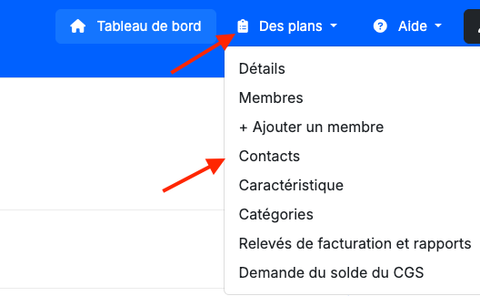 - À partir du tableau de bord, ouvrez le menu Plan et sélectionnez Contacts