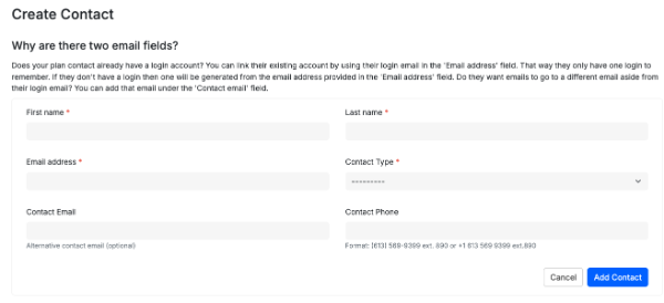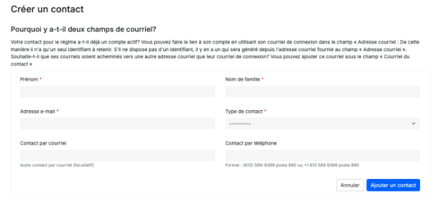 💡 Astuce : Si la personne est déjà membre du régime, vous pouvez utiliser l’adresse courriel liée à son profil de membre. Elle pourra ainsi se connecter à son Centre des membres ou à l’Espace Plan avec la même adresse courriel et le même mot de passe. - Assurez-vous de sélectionner le bon type de contact dans le menu déroulant. Vous pouvez consulter les rôles et leurs autorisations pour vérifier que vous avez bien attribué le bon niveau d’accès.